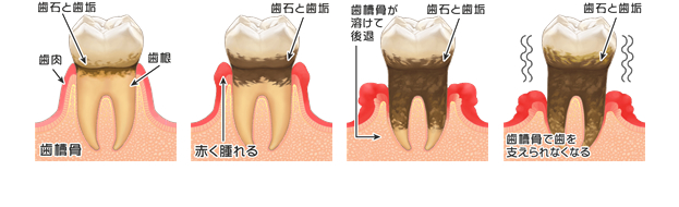 歯肉炎になるとブラッシングなどの刺激で容易に歯肉出血します。そして歯周病になるとおもに真性ポケットの形成、歯肉の炎症、歯槽骨の吸収という3つの臨床症状が見られます。