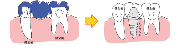 インプラントとは歯のない所の顎の骨に埋め込む人口の歯根です。顎の骨にインプラントがつくまでは3ヶ月〜6ヶ月ほどかかります。