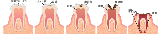 熱いものがしみるなどの症状になると、むし歯が神経まで達していることが多く、神経をとる治療をしなくてはいけなくなります。